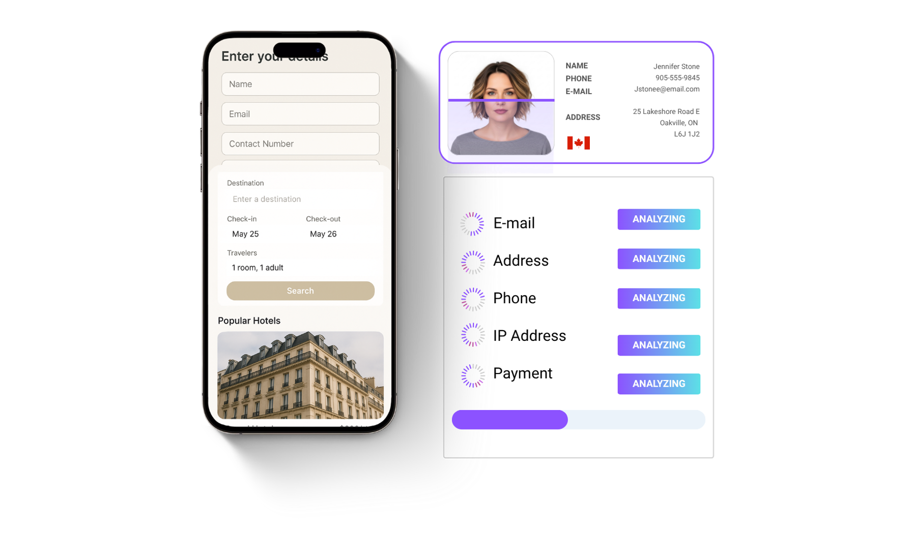 The system analyzes email validity, phone number verification, IP address origins (detecting VPNs/proxies), booking patterns, payment event details, and cross-references this against our proprietary hospitality database while maintaining GDPR compliance.